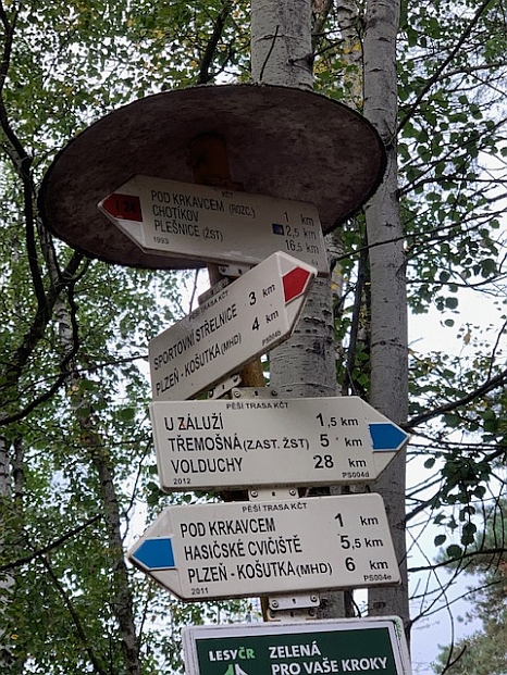 Ich war auf der grünen Wegmarkierung von links oben gekommen und weiter bis zum Krkavec hochgestiegen. Ab jetzt wollte ich der roten Markierung nach Chotíkov folgen.
